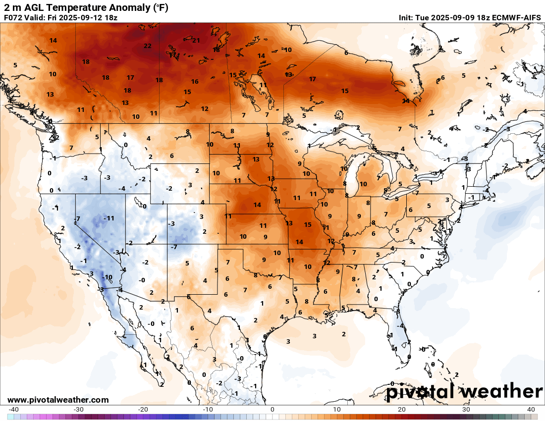 After a cool early September for much of the central and eastern United States, a significant shift to warmer weather is on tap over the next several days. By Friday, afternoon temperatures will be running as much as 15F above normal (forecast temperature anomaly for Friday afternoon shown above) across the central US, with a few record highs possible. Even more anomalous warmth is expected north of the border across much of Canada, particularly in the western prairies.