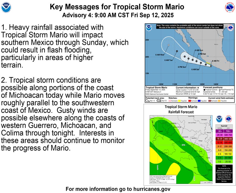In the tropics, Invest 95E has become Tropical Storm Mario off the coast of southwest Mexico, and tropical storm watches have been issued for part of the coast. Mario is a very small storm and because of that the forecast for it is much more uncertain than normal. For now, NHC is forecasting it to slowly move parallel to the coast and gradually intensify into a strong tropical storm before weakening over colder water.