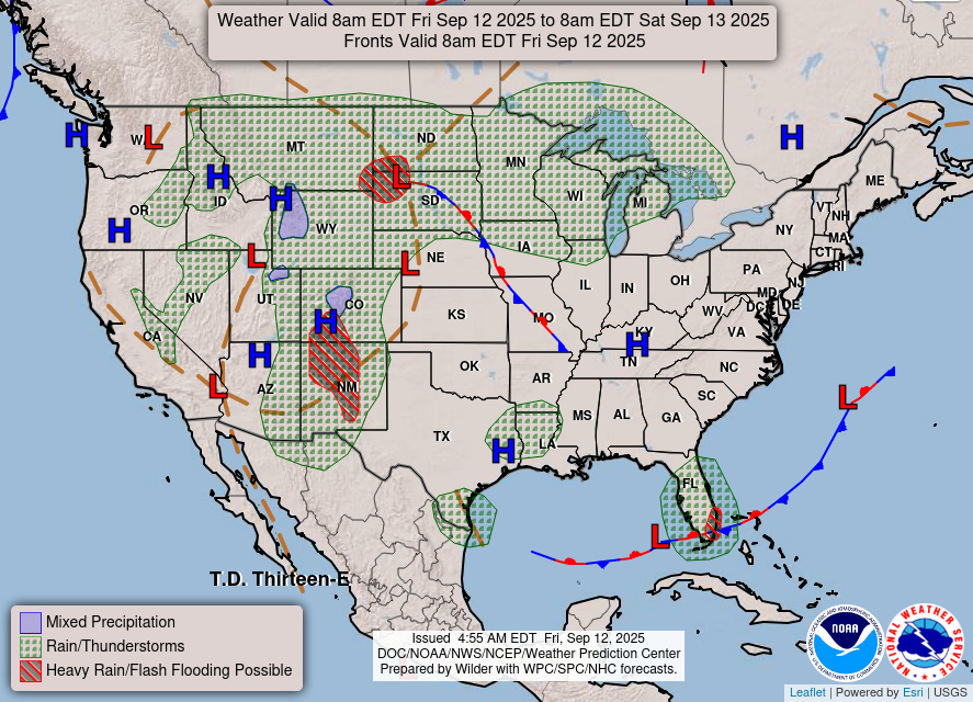 On today’s weather map, showers and thunderstorms will continue to be scattered across much of Intermountain West and upper Midwest, with slight (level 2 of 4) risks of flash flooding across parts of the southern Rockies and the Dakotas. Showers and storms will also continue over Florida, with a slight risk for flash flooding across southeast Florida.