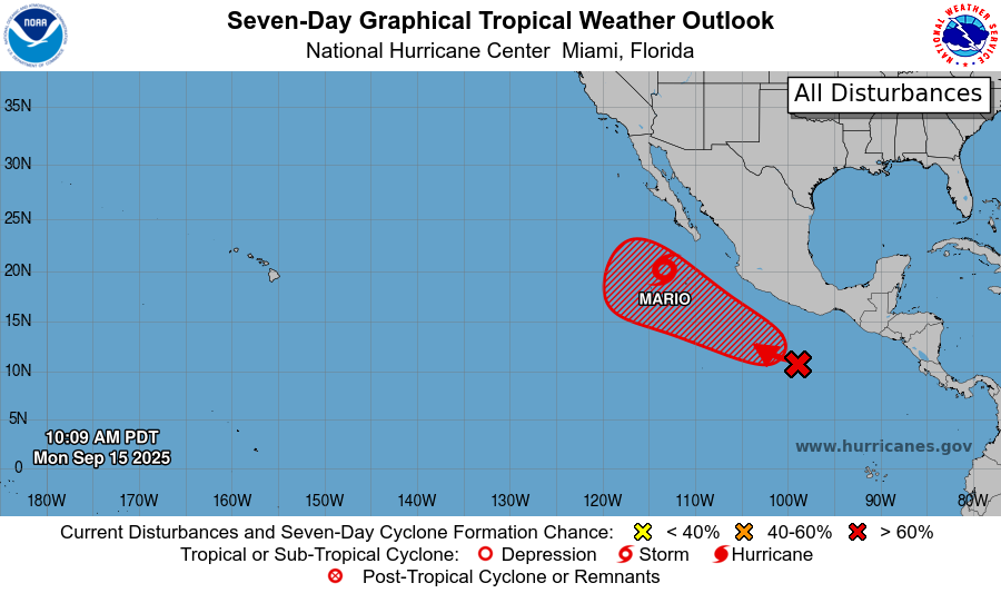 Finally, in the Pacific, Mario is a 60 mph tropical storm in southwest of the southern tip of Baja. It is forecast to gradually weaken over the next couple of days as it moves over colder water. However, an upper level weather disturbance off the California coast will pull remnant moisture from Mario up into California later this week, potentially spurring thunderstorm development which could be a fire weather concern. I will have more on this in tomorrow’s newsletter. Another system will likely develop behind Mario later this week as shown on the NHC outlook — that system should be far enough off the Mexican coast to not be much threat for them in the next several days.