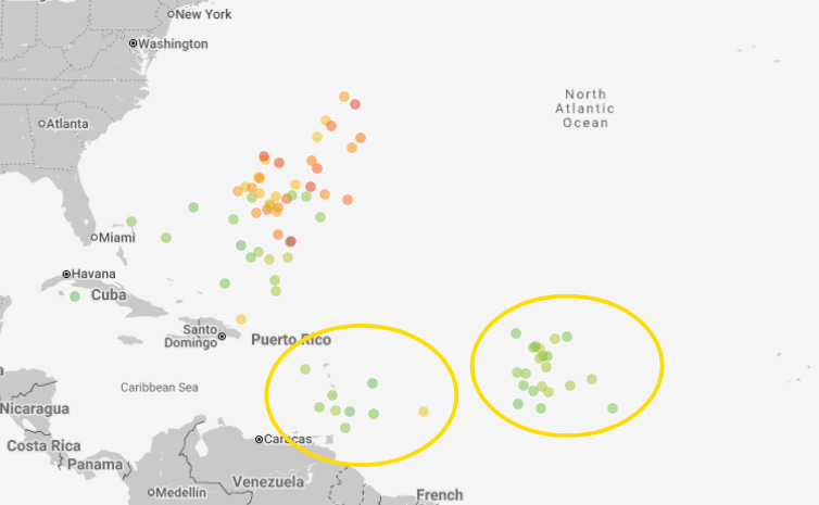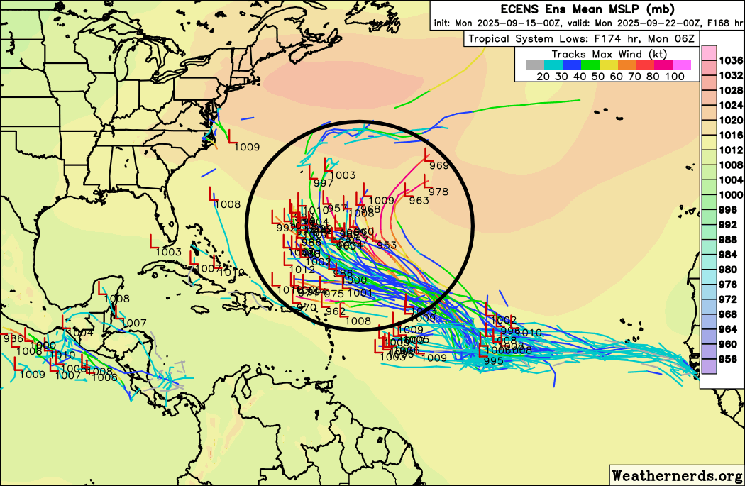 As far as track, both the Google DeepMind AI and European ensemble generally show a west-northwest track for the next week to a position somewhere north/northeast of the eastern Caribbean islands. However, as you can see in the circled area above, there is a wide difference in positions within the European ensemble model forecasts a week from now, varying from just north of Puerto Rico to well out to sea in the central Atlantic. A big reason for this forecast spread is rather large differences in exactly where and how soon development of an organized system will occur. Regardless, right now the probability of any significant land interaction with 92L seems low — but of course we will watch it closely.