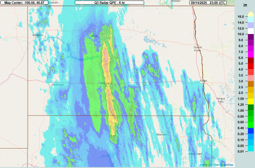 With such unusual moisture in the atmosphere, it is of course not surprising that there was extreme rainfall as well. The MRMS 6 hourly rainfall product ending at 6 pm CT showed a band of up to 4” of rain across central North Dakota including the Bismarck area. Bismarck Municipal Airport picked up 1.93” of rain in an hour between 2:50 and 3:50 pm, and had a total for the day of 2.44”, the fourth highest daily September rainfall on record (records back to 1874) and more than the entire September monthly normal value of 1.72”.