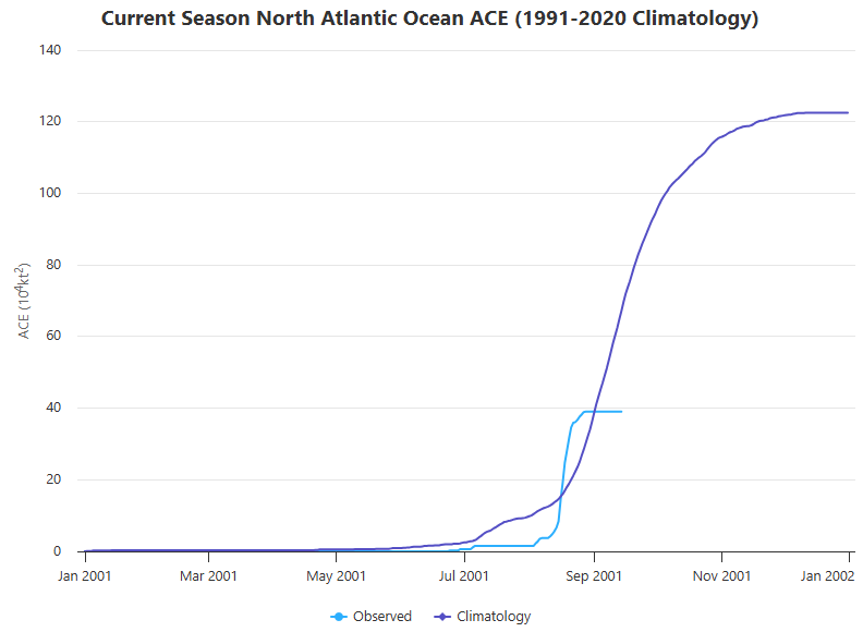 Turning now to the tropics, last week we managed to go the entire week of what is pretty much the peak of hurricane season without any system in the Atlantic. The Colorado State University real-time accumulated cyclone energy (ACE) tracker shows that with no activity during the peak of the season, we are now more significantly falling behind “normal” values of tropical activity.