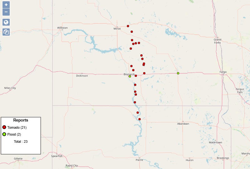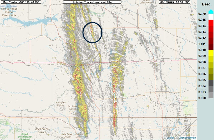 Monday is usually my weekly tropical deep dive post, but before I get into that, I want to recap an event that almost seemed a bit tropical in nature, even though it was focused in North Dakota. A highly unusual for September tornado and flash flood event occurred from northern South Dakota north across central North Dakota on Sunday, with more than 20 reports of tornadoes received by SPC. While some of these individual tornado reports will be combined into longer tornado tracks, there were certainly several tornadoes in the region. Given that North Dakota has only had a total of 27 tornadoes in the month of September ever (dating back to 1950), this is obviously a climatologically rare event.