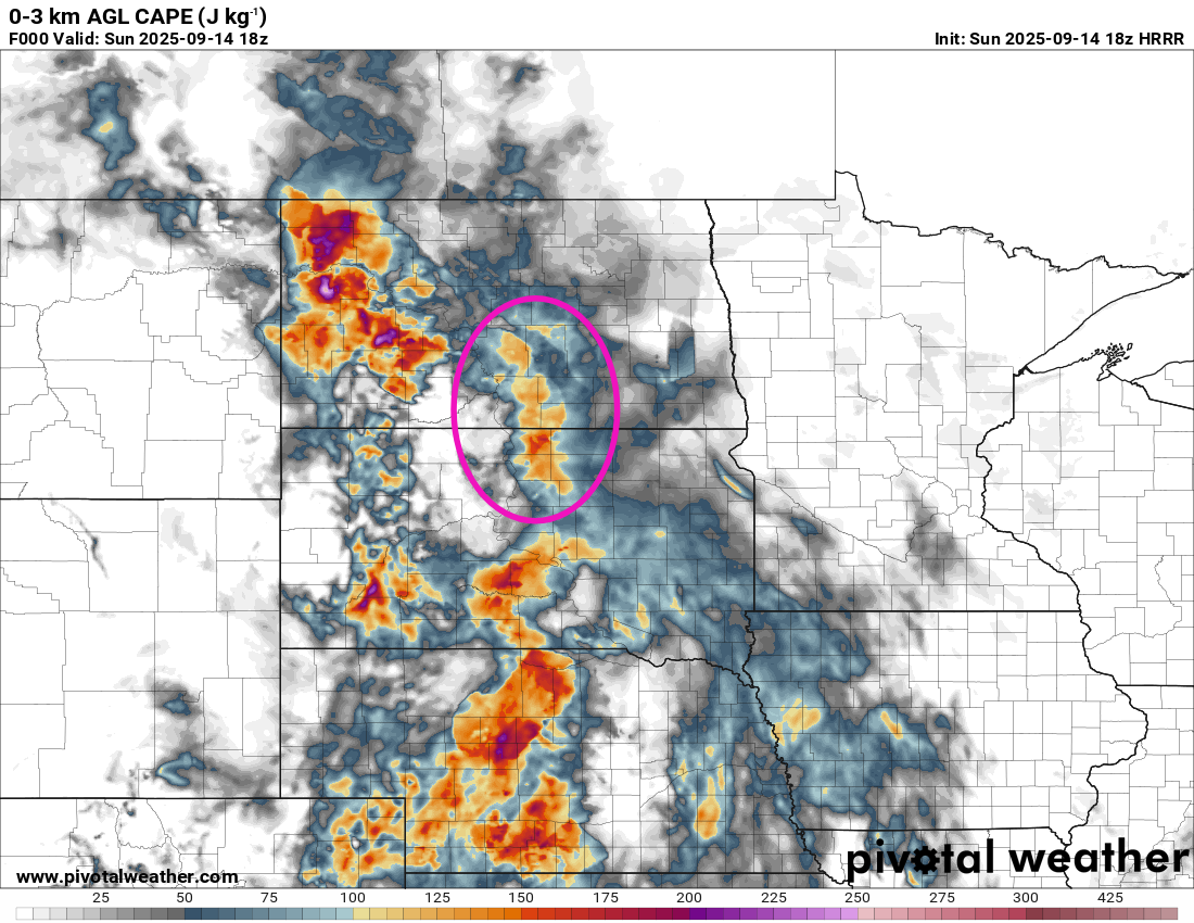 However, if we look at 0-3 km CAPE — a parameter which shows how much instability is focused in the lower levels of the atmosphere up to 3 km AGL — there is an area of greater than 100 J/kg in south central North Dakota at the same time of the Bismarck sounding. For the 0-3 km CAPE, this is a rather large value.