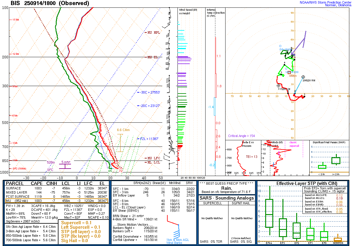 The other key feature this upper air sounding shows is that the atmosphere is unstable, but not strongly so, with surface based convective available potential energy (CAPE) values around 1000 J/kg. In the Northern Plains during their peak severe weather season in the summer, values of 4000 J/kg or larger are common on severe weather days. One of the measures of atmospheric instability supportive of thunderstorms is the lapse rate, or the change in temperatures with height. At a very basic level, the colder the temperature is aloft above warmer temperatures down low, the more unstable the atmosphere is. On this sounding, the mid level lapse rate between 3 and 6 km was only 5.4C per kilometer, indicative of very weak instability aloft in the atmosphere.