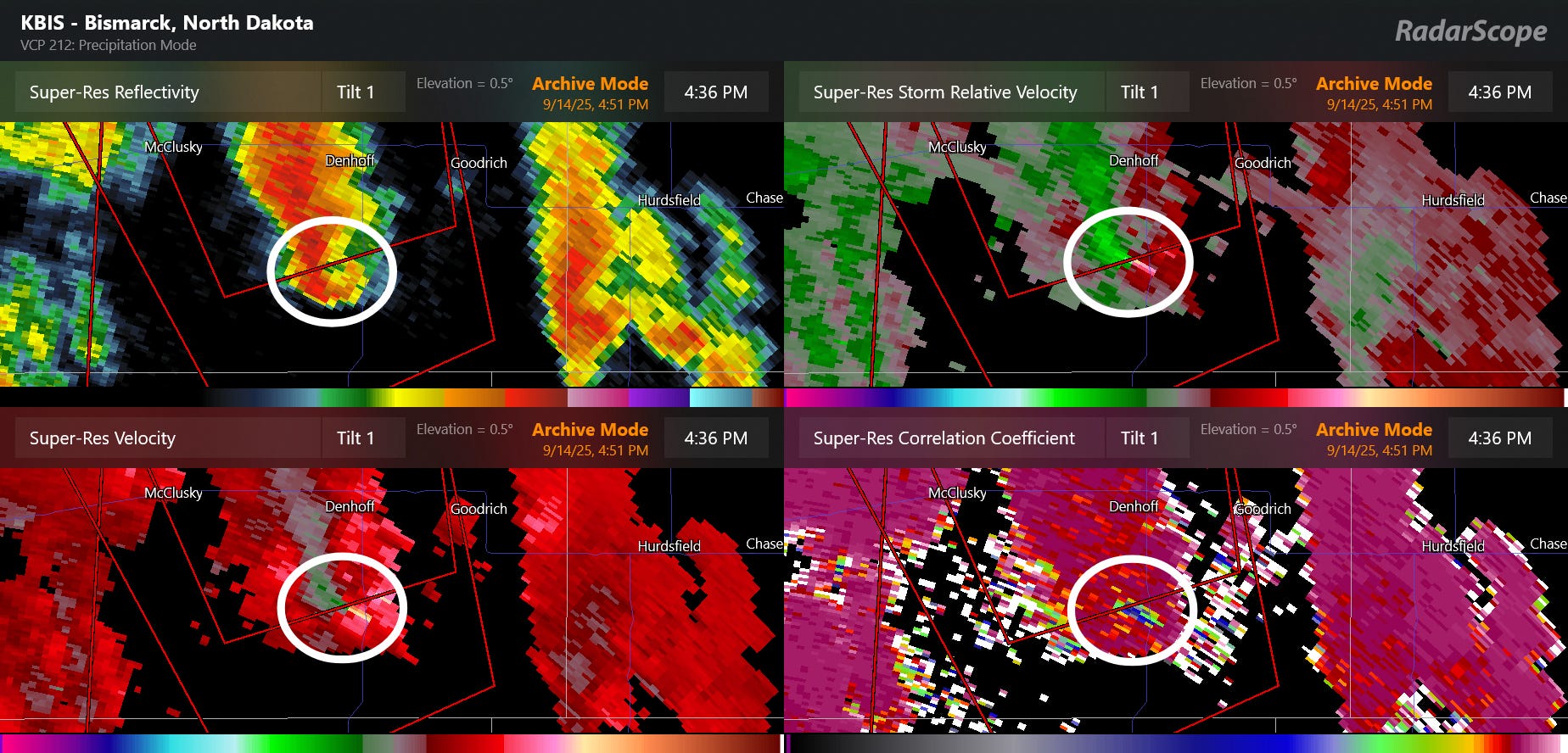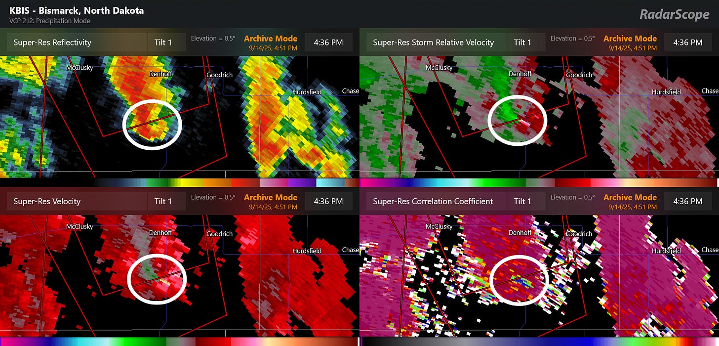 To give an example of what these supercells look like on radar, I have focused on one from the area circled in black northeast of Bismarck on the rotation tracks product. Even though the supercell thunderstorm is rather small and has a storm top of around 35,000 ft AGL — relatively modest for a severe storm — it has strong low level rotation — the green and red next to each other circled in the upper right panel. In the lower right, the correlation coefficient — a radar product showing the size and shape of the particles being detected — shows an area of very low values within the white circle. This is a tornadic debris signature, i.e., where the tornado is lofting debris and it is being detected by the radar. Damage was in fact reported in this area.