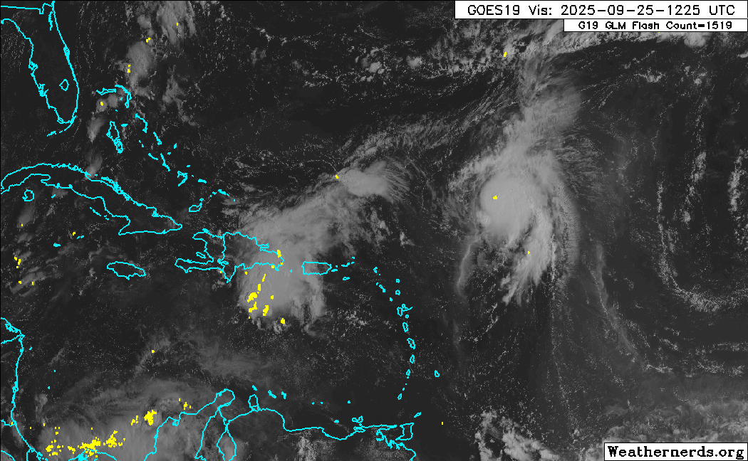 That brings us to Tropical Storm Humberto and the gradually organizing disturbance 94L, which look destined to bring us a complex meteorological and forecast scenario in the coming days. Humberto is still under a bit of westerly upper level wind shear — partially from upper level winds flowing out of 94L — but it is getting better organized and now has maximum sustained winds of 50 mph. 94L is also getting better organized, although the low level circulation associated with it looks to be on the northern edge of the mass of thunderstorms, somewhere near or just offshore north of the Dominican Republic. Squalls of heavy rain and gusty winds will continue over Hispaniola and Puerto Rico today.