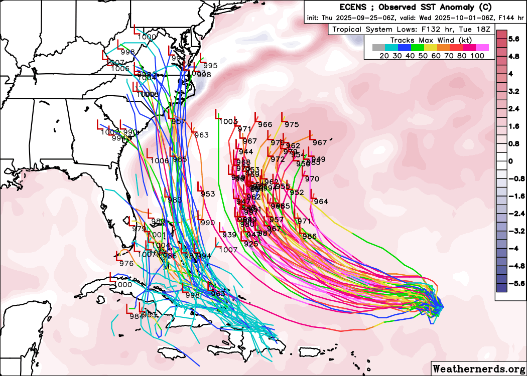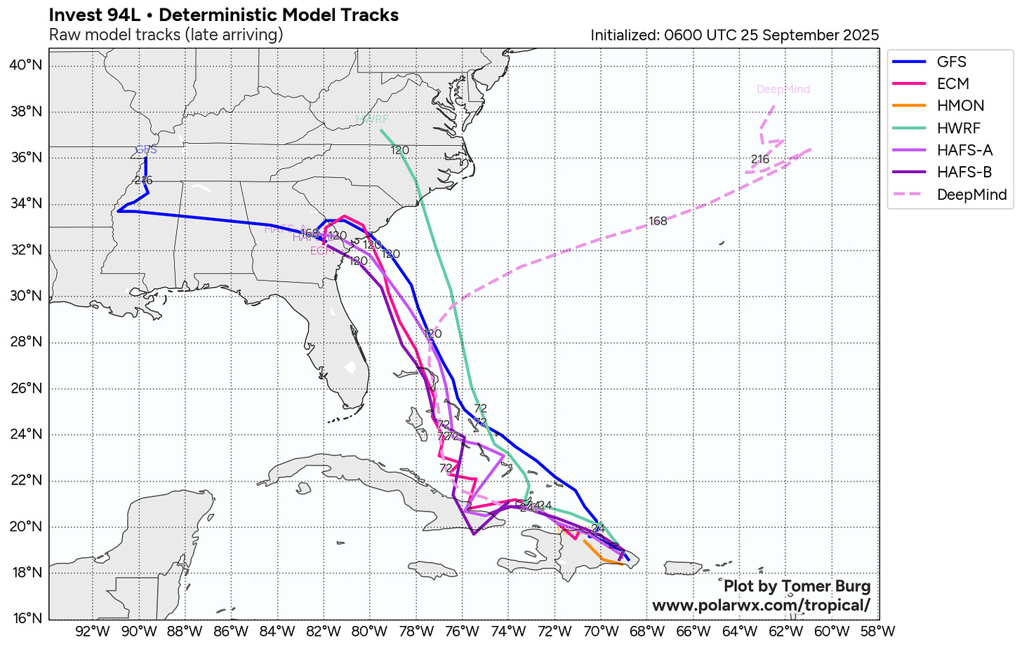 The longer term endgame for 94L is much more uncertain. As you can see in this map above, most of the traditional physical based models generally track 94L toward coast — while the AI models (Google DeepMind shown in the graphic) on average show a turn more to the northeast to follow behind Gabrielle toward Bermuda. However, it needs to be stressed that the Google Deep Mind (GDM) is showing a lot more dispersion and run-to-run model differences than I have seen in it so far this year, as it does have a number of members on each model run showing a solution more like the physical models. In fact, the 1800 UTC run of the GDM yesterday had about 50% showing a track closer to or over the Carolinas, although more recent runs have lesser numbers with that scenario.