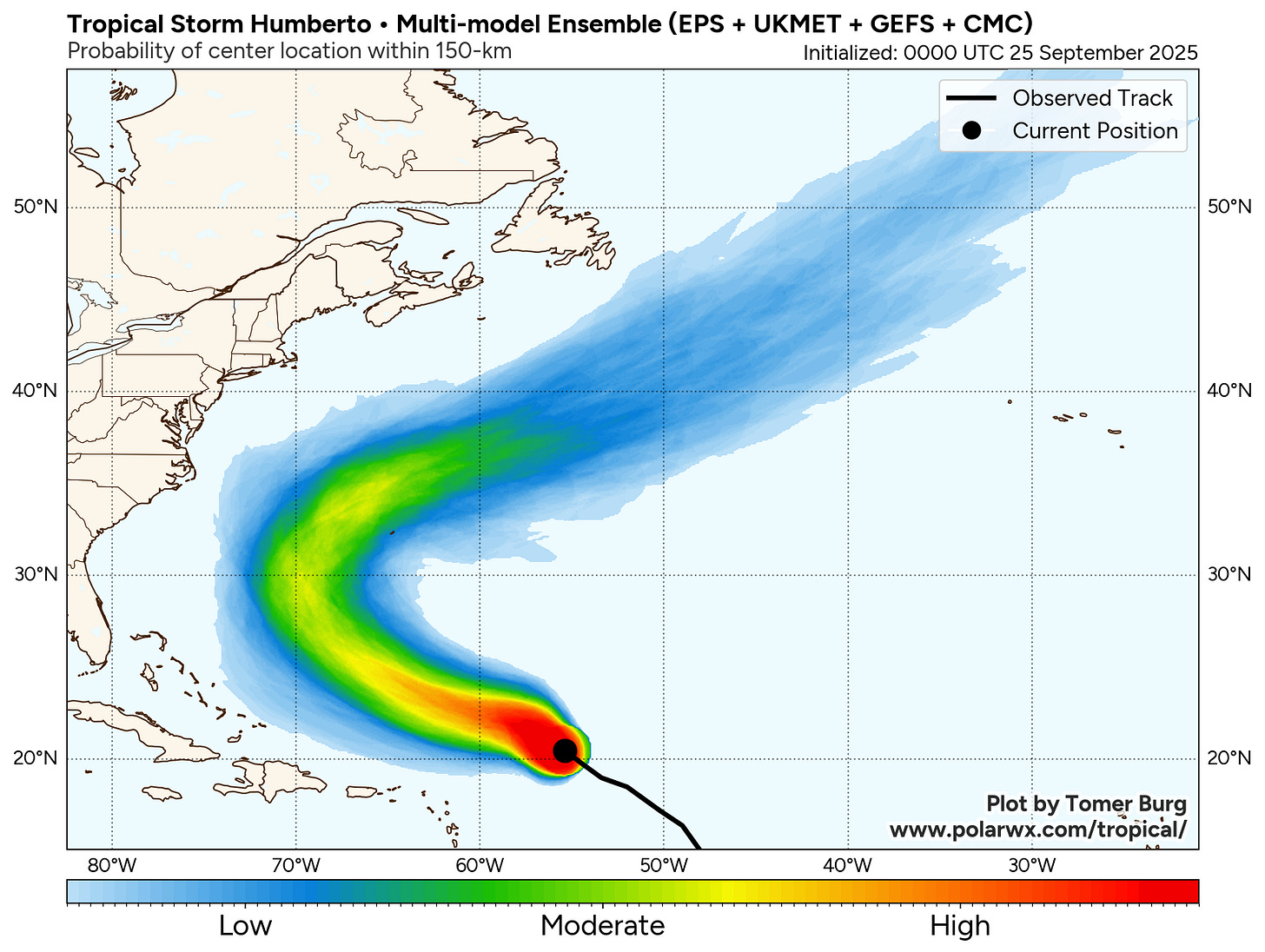 With those caveats in mind, the forecast for Humberto still seems the more straightforward. Both the physical and AI models pretty well agree on the idea of the system moving northwest and then eventually recurving more northeast as it rotates around Bermuda. Assuming the hurricane is as large and intense as anticipated, this forecast track would pose a serious threat to Bermuda, and obviously people with interests there should be monitoring forecasts closely.