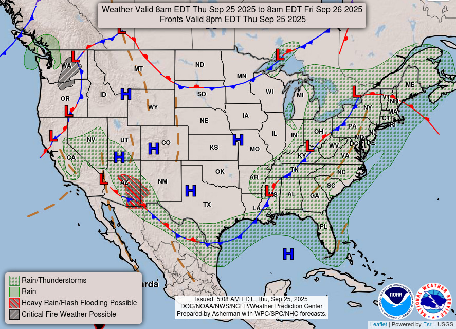 In the US today, scattered to numerous showers and storms will continue across the east ahead of the slow moving storm system associated with upper level trough of low pressure we talked about above. Above normal moisture could fuel heavy downpours with afternoon and evening storms over Arizona, where the Weather Prediction Center has outlooked a slight (level 2 of 4) risk of flash flooding. Critical fire conditions are anticipated in interior parts of Washington and northern Oregon.