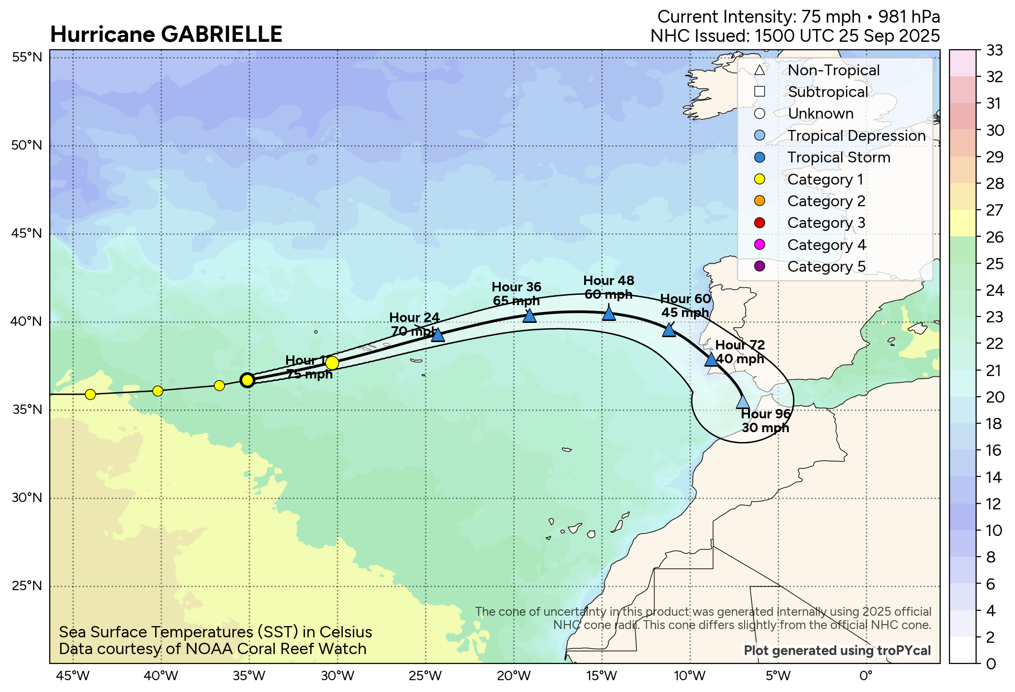 As expected, Gabrielle has weakened due to wind shear and cooler waters, but is still a minimal hurricane. In the satellite imagery above, you can see the large cloud mass of an upper level trough of low pressure approaching the hurricane from the northwest, and this will help keep the system as a minimal hurricane or high end tropical storm as it moves across the Azores over the next day. Significant wind, surge and rain impacts are expected in those islands and a hurricane warning remains in effect. Gabrielle should weaken and become post-tropical as it moves toward Iberia, but will still cause some wind and rain impacts there this weekend.