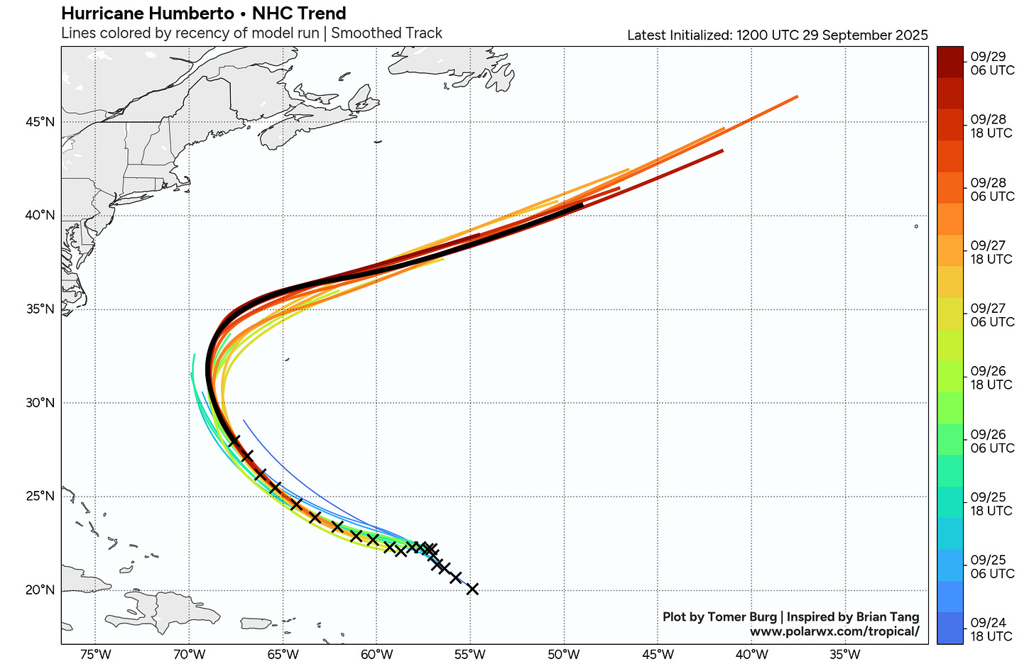 In contrast to what it has seen with Imelda, the forecast trend with Humberto has been favorable for Bermuda, as it has continued to shift farther west and northwest —the black line in the forecast graphic above is most recent NHC forecast with earlier forecasts colored as shown in the legend at right — meaning the impacts will be less. Still, high surf, gusty winds and some squalls will be experienced, and a tropical storm watch remains in effect for Bermuda.