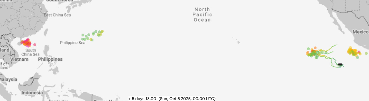 Taking a quick look at the Pacific, Typhoon Bualoi which we discussed last week made landfall in central Vietnam in the last 24 hours, causing intense winds, flooding and storm surge with at least 13 people killed. This is in addition to severe damage caused earlier by Bualoi in the Philippines which left 20 dead. Bualoi will continue to weaken as it moves inland over Southeast Asia, but the GDM system (5 day forecast shown above) suggests another intense typhoon will develop between southern China and the northern Philippines later this week and threaten the region.