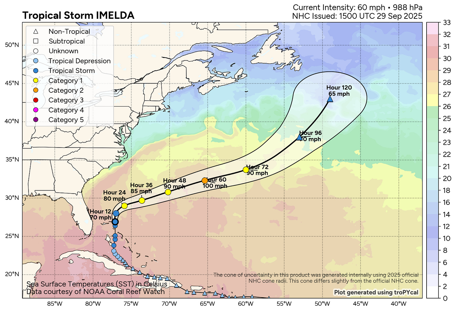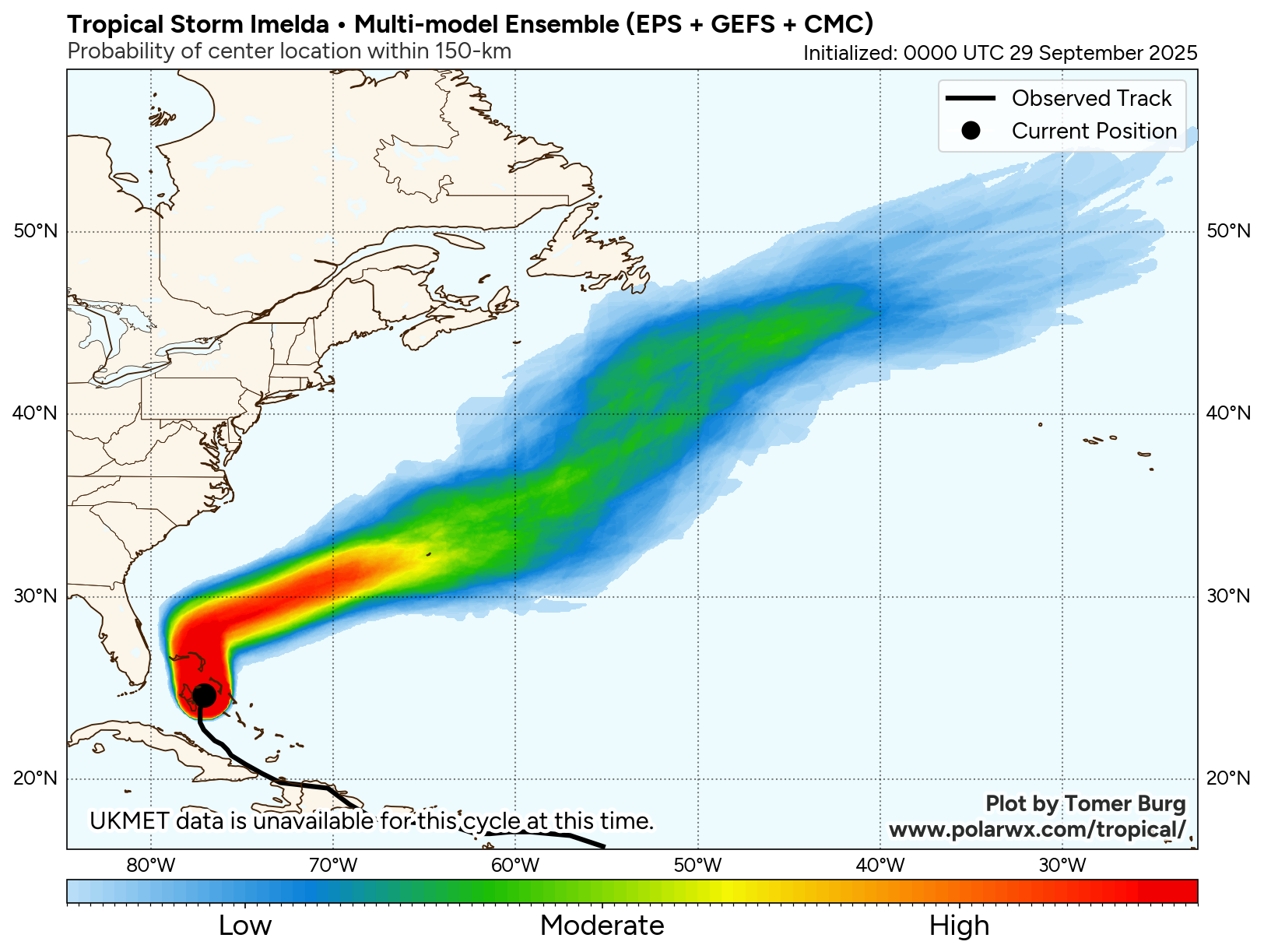 The model consensus suggests that Imelda will move near Bermuda as a hurricane during the midweek period, and a hurricane watch will likely be issued for the island later today. While there is obviously some uncertainty about the exact track and intensity as it passes the island, the potential for significant impacts exists and interests in Bermuda should be preparing accordingly.