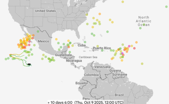 After Humberto and Imelda finally become post-tropical late this week, the models suggest that the Atlantic will likely stay active. The Google DeepMind (GDM, 10 day forecast shown above) AI system shows the potential for development in a few different areas: east of the Caribbean, in the vicinity of the Yucatan Peninsula, and in the Southwest Atlantic. The GDM has been particularly bullish on the tropical wave east of the Islands, consistently showing it developing into a significant hurricane in about 7-10 days. Meanwhile, the physics based European ensemble seems more focused on the potential for development in the Gulf or northwest Caribbean in the week 2 period, an area that is more favored climatologically as we get into October. Regardless, it seems likely that this post-peak active period will continue.
