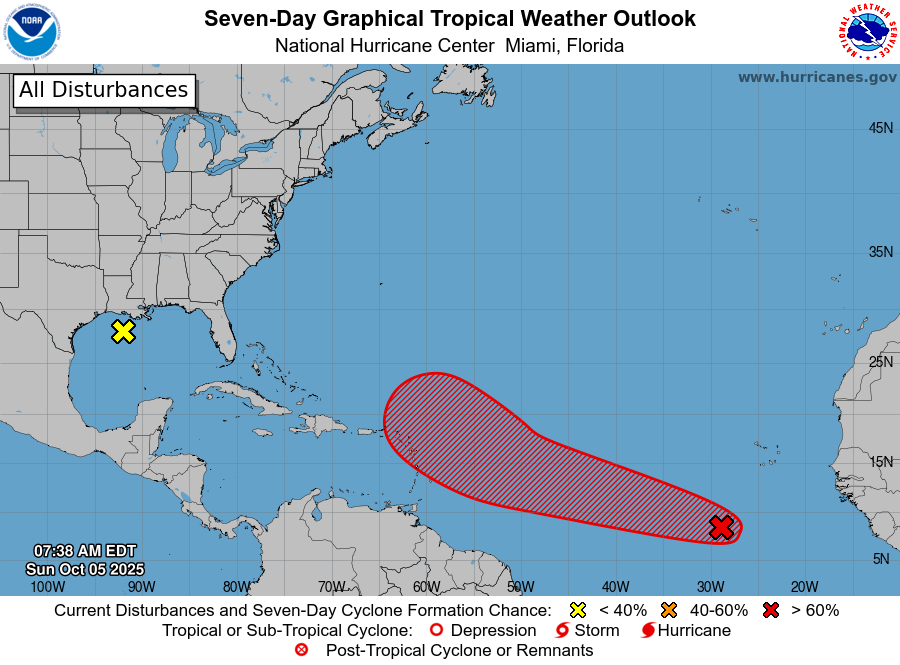 The tropics remain active, with newly designated Invest 95L in the eastern Atlantic. This system is showing some early signs of organization, and the National Hurricane Center now has a high risk (70%) probability of it developing into a tropical cyclone the next several days. While the eastern Caribbean needs to keep an eye on this system, current model forecasts (and the time of year) suggest this system should not pose a threat to the US. A weak area of low pressure in the northern Gulf is not expected to develop (near 0 chance per NHC), while the system in the southwest Atlantic we were discussing has also become a minimal risk for development.
