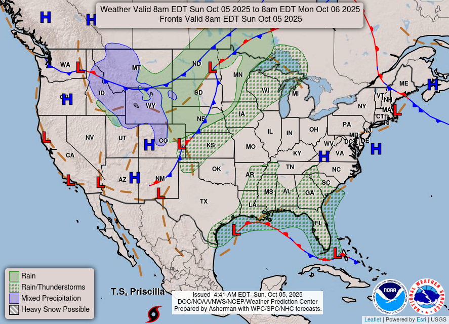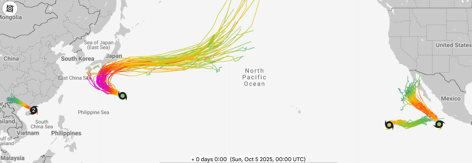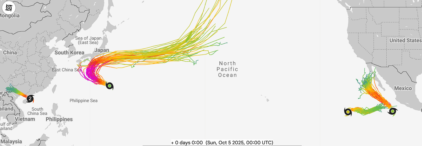 In the eastern Pacific, category 1 Hurricane Octave (westernmost system in eastern Pacific on Google DeepMind forecast above) is on a weird east movement, but is forecast to weaken and eventually dissipate in the next few days. Meanwhile, Tropical Storm Priscilla is expected to become a large hurricane as it moves northwest this week. While it currently appears that it will pass well west of Baja California, it could provide enhanced moisture to northwest Mexico and the Southwest US in several days.
