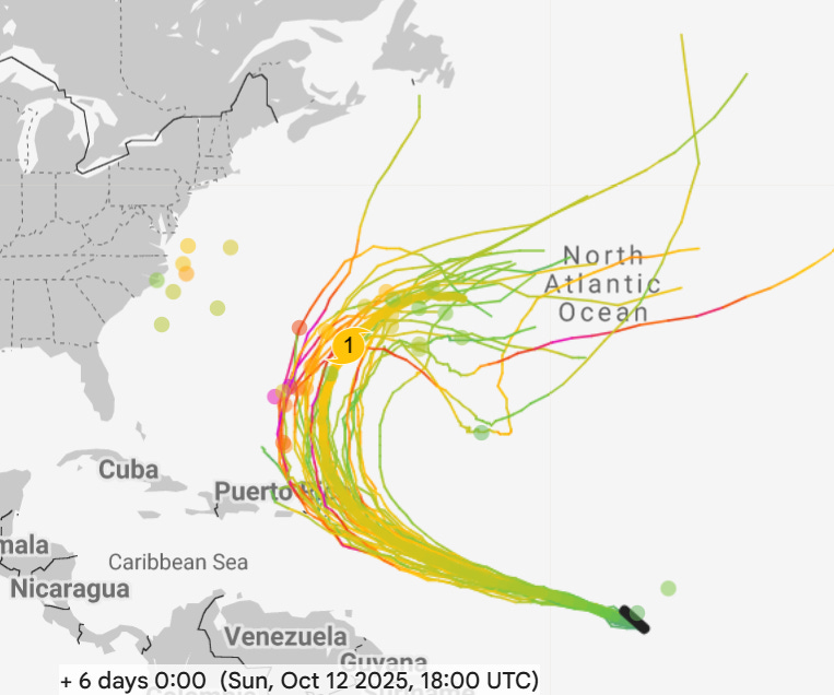 The Atlantic tropics continue to be active as well, with Invest 95L in the eastern Atlantic now having an 80% chance of developing into a tropical cyclone in the next couple of days. While most of the model trends suggest the system saying just east and northeast of the islands of the northeast Caribbean (Google DeepMind 6 day forecast for this weekend shown above), it is certainly close enough to require monitoring. We will also be keeping an eye off the Southeast and Mid-Atlantic coast for potential development later this week — while this system would be more of a hybrid system than a pure tropical system, it could potentially produce some impacts along the East Coast. More on this as the week goes on.