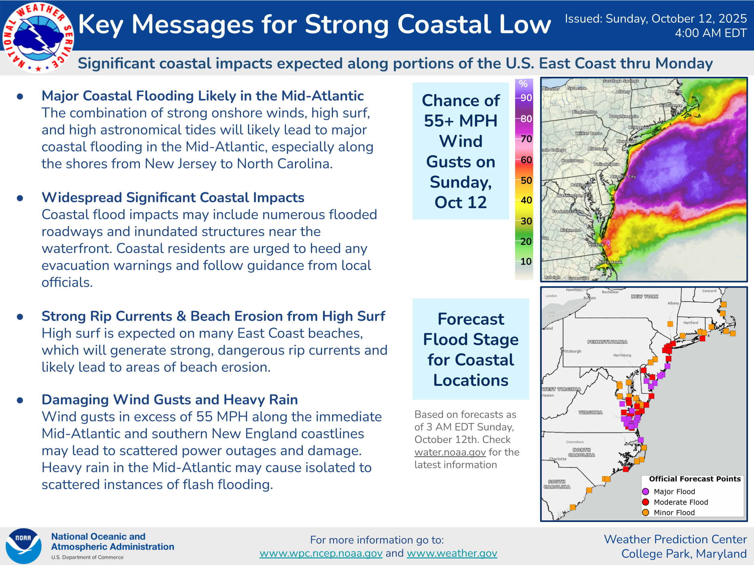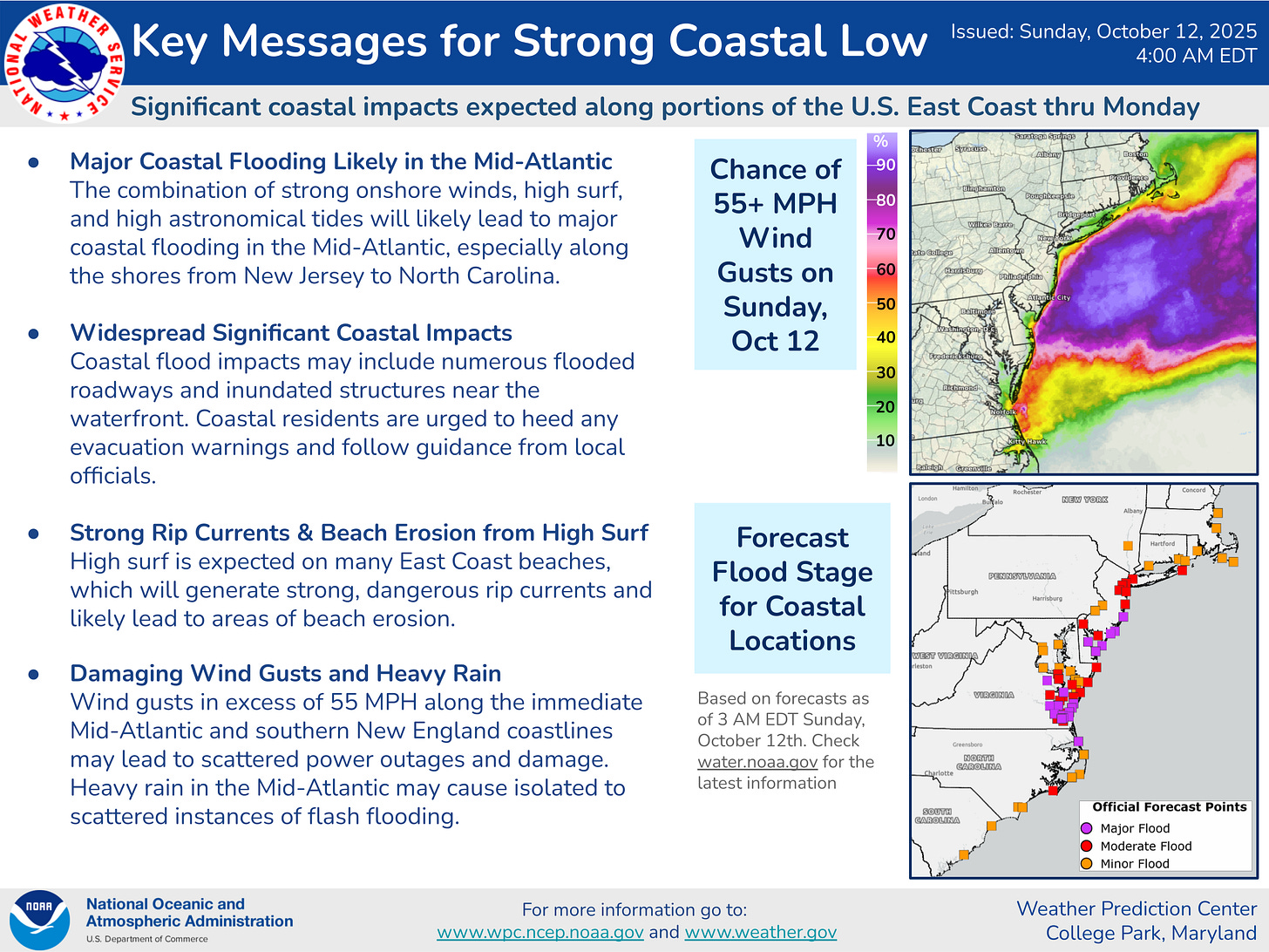 While how much low pressure development of any sort occurs farther north will impact the details as far as specific timing and magnitude of impacts, the overall idea of widespread, significant coastal impacts from the Carolinas north into southern New England through early next week still looks on track, with the maximum impacts in the Delmarva and southern New Jersey. Strong winds, major coastal flooding, serious beach erosion, strong rip currents and heavy rainfall all look likely. Winds look to peak out today while the three high tide cycles over the next 30 hours look to see the worst of the coastal flooding.