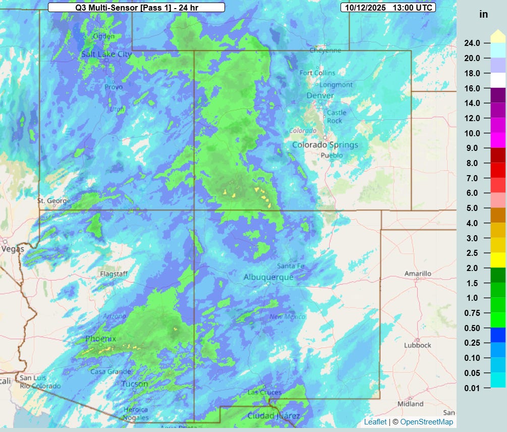 We have talked a lot about extreme levels of moisture this year, and record moisture is helping to fuel the ongoing flash flooding in the Southwest. I pointed out on Friday the record breaking precipitable water values observed on upper air balloon data from Tucson. This morning, I wanted to highlight this Bluesky thread from colleague Brian McNoldy discussing another aspect of the record breaking moisture in the Southwest as seen in the dewpoint values at Albuquerque. Brian noted that with a 60F dewpoint this morning, Albuquerque was seeing their highest dewpoint ever between the dates of October 12 and May 24, and that today is the third consecutive day with a record high dewpoint at that location.