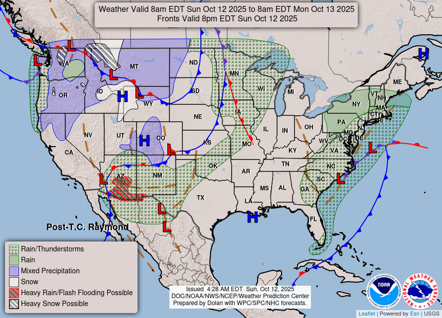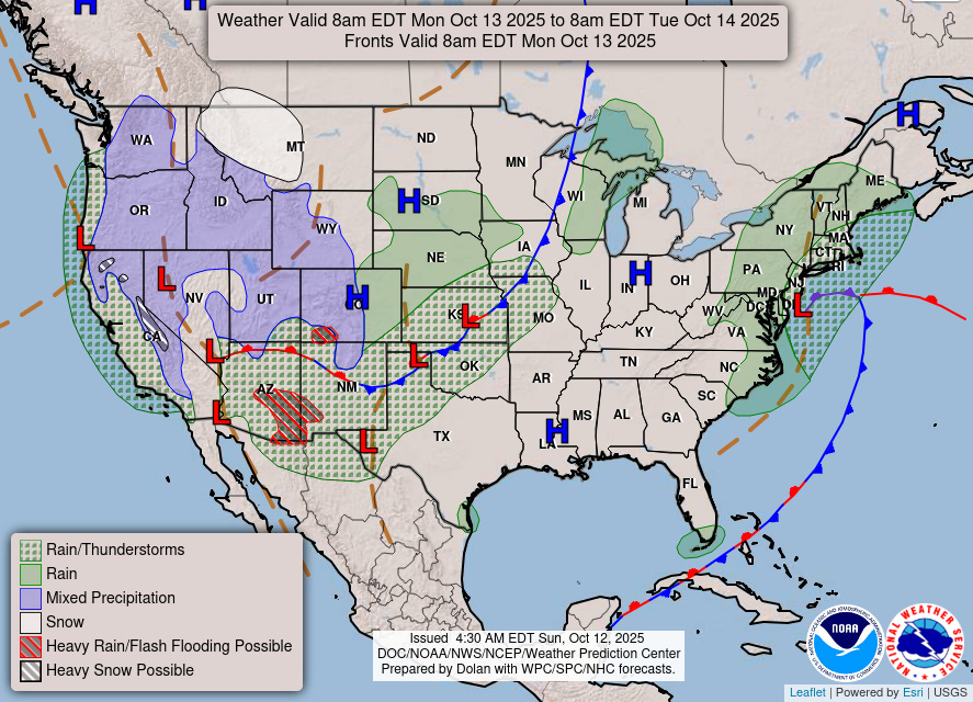 On Monday, a new and intense upper level low pressure center will drop south along the West Coast, which will spread rain and some heavy mountain snows across much of the western United States. Winter storm warnings are in effect for the higher elevations of the Sierra Nevada as well as the northern Rockies in Montana. Additional flash flooding concerns are anticipated in Arizona, southwest New Mexico and southwest Colorado.