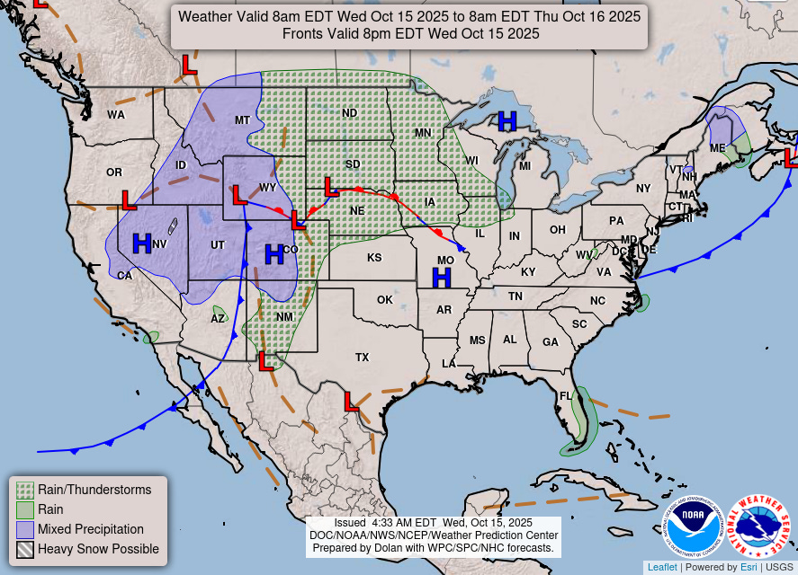 The weather is finally taking a short breather across the Lower 48. While a slow moving storm system will bring some rain and mountain snows to western and central parts of the nation, the overall risk of organized or widespread hazardous weather is low today.