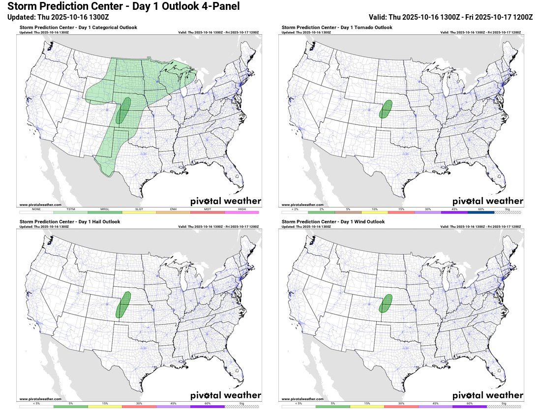 Today will start to see the gradual ramp up in the intensity of thunderstorm activity with this storm system as it restrengthens over the next few days. A few supercell severe thunderstorms are possible in the High Plains of eastern Colorado into central Nebraska, and the Storm Prediction Center (SPC) has a marginal (level 1 of 5) risk in place.