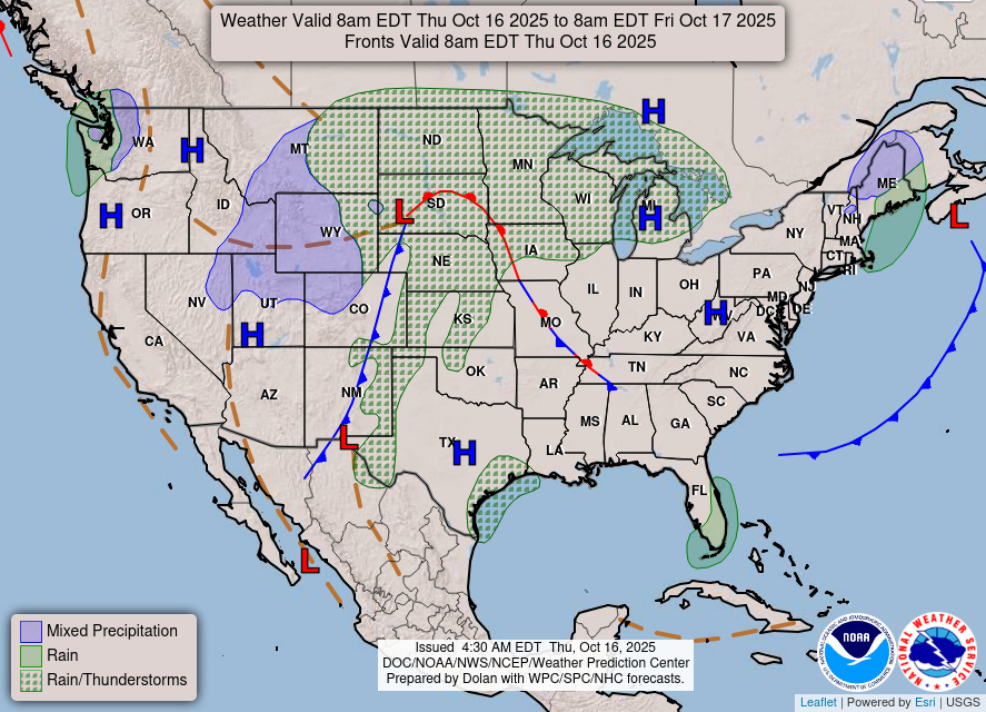 Looking at the weather, today will again see the storm system we have been tracking the last several days slowly moving across the center of the country, with scattered rain and storms and some higher mountain snow in the Intermountain West.