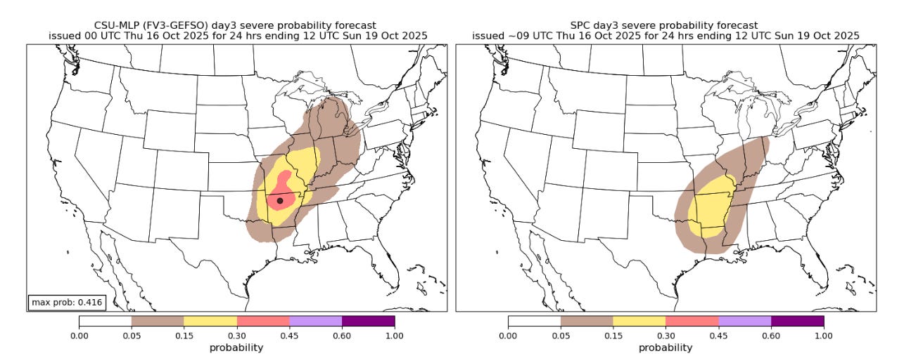As the storm system continues to intensify on Saturday, a greater risk of severe weather looks to develop over parts of the Mid-South and Mid-Mississippi Valley. The Colorado State University Machine Learning Probabilities (CSU-MLP) system — which I have found to be a quite good tool in the last couple of years — has been trending more bullish with its probabilities for this event as can be seen above (CSU-MLP on the left, day 3 SPC outlook on right). There are still some model discrepancies here to sort out, but given the model trends this will be a system to keep an eye on.