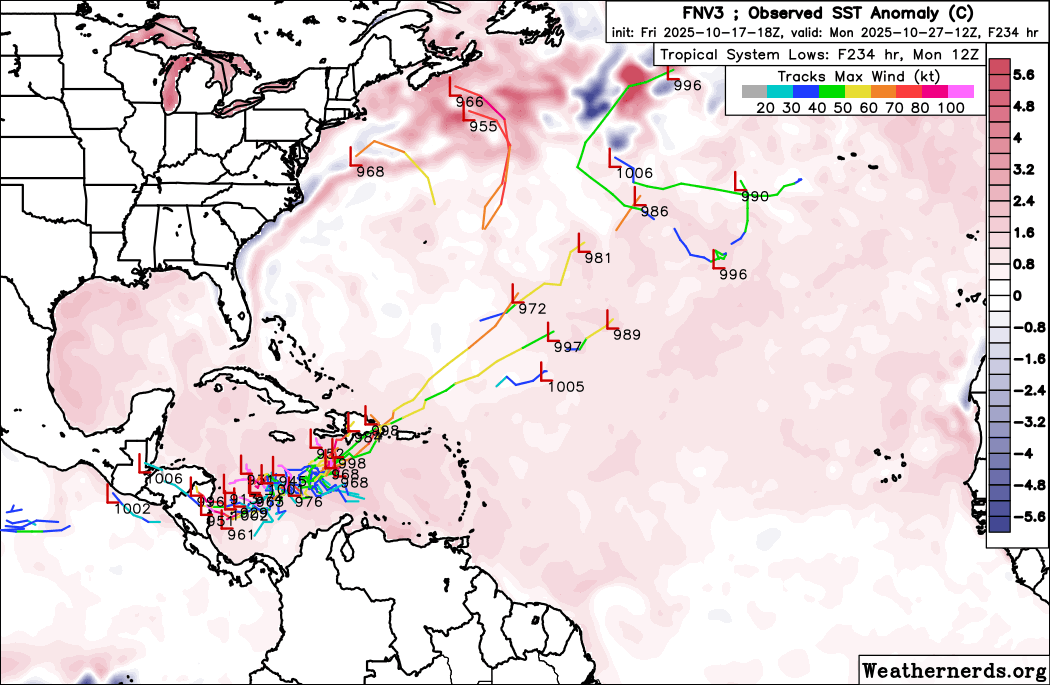 With the potential tropical system next week in the Caribbean, NHC has held the probability of development at 30%. The biggest change in the models today is that the AI models — Google DeepMind shown above — trended toward the physical European ensemble with slower development that stays focused primarily in the Caribbean rather than lifting out to the north. If anything, the European ensemble became even more focused on slow development in the western Caribbean. Again, we have a number of days to watch this.