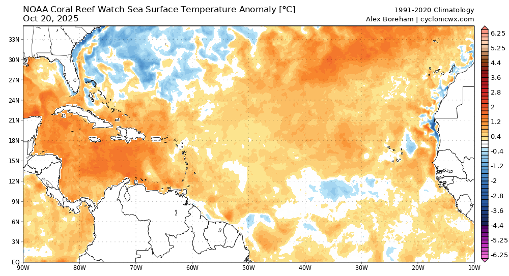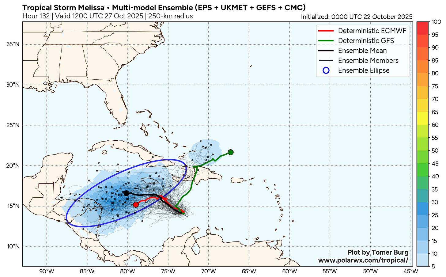 The water temperature of the central and western Caribbean is much above normal, and highly suggestive of rapid intensification given other favorable parameters, which look to as if they will become more supportive over the next few days. SHIPS already shows the probability of rapid intensification over the next 72 hours to be 5 times normal, and conditions are only expected to become more favorable with time. Climatologically speaking, this region has produced many major hurricanes in October historically. Bottom line — while there still exists quite a bit of uncertainty with Melissa, the potential for a category 3+ hurricane in the western Caribbean this week has become rather high, and people living in or with interests in Cuba, Jamaica, Hispaniola and the Bahamas should be monitoring forecasts closely and undertaking preparations as advised by local authorities.