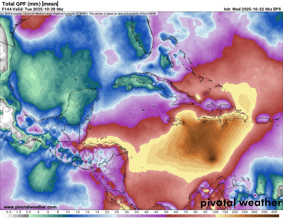 The threat of extremely heavy rainfall and potentially disastrous flash flooding also continues to increase for Jamaica and Hispaniola. The above is the 6 day rainfall forecast from the most recent European ensemble model, with amounts of up to 15” in these islands. Given the terrain, this would certainly result in a serious risk of flash floods and mudslides. It is important to note that more rain would likely occur beyond this time and expand to include Cuba and the Bahamas depending on when and where Melissa moves and starts to lift north-northeast out of the Caribbean.