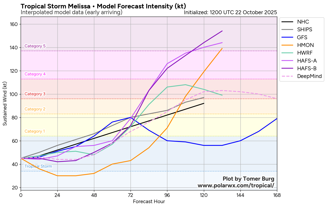 Ironically, the slower organization of Melissa will likely mean an eventual significantly higher ceiling for the intensity of the storm. The SHIPS model shows the wind shear dramatically weakening to almost zero over the next 48 to 72 hours, and in response most of the better intensity and hurricane models make Melissa a major hurricane by this weekend, and the most recent NHC forecast shows Melissa becoming a category 3 hurricane. In fact, you can see in the forecast intensity graphic above that three of the hurricane-specific forecast models — HMON and the two HAFS models — forecast Melissa to become a category 5 hurricane.