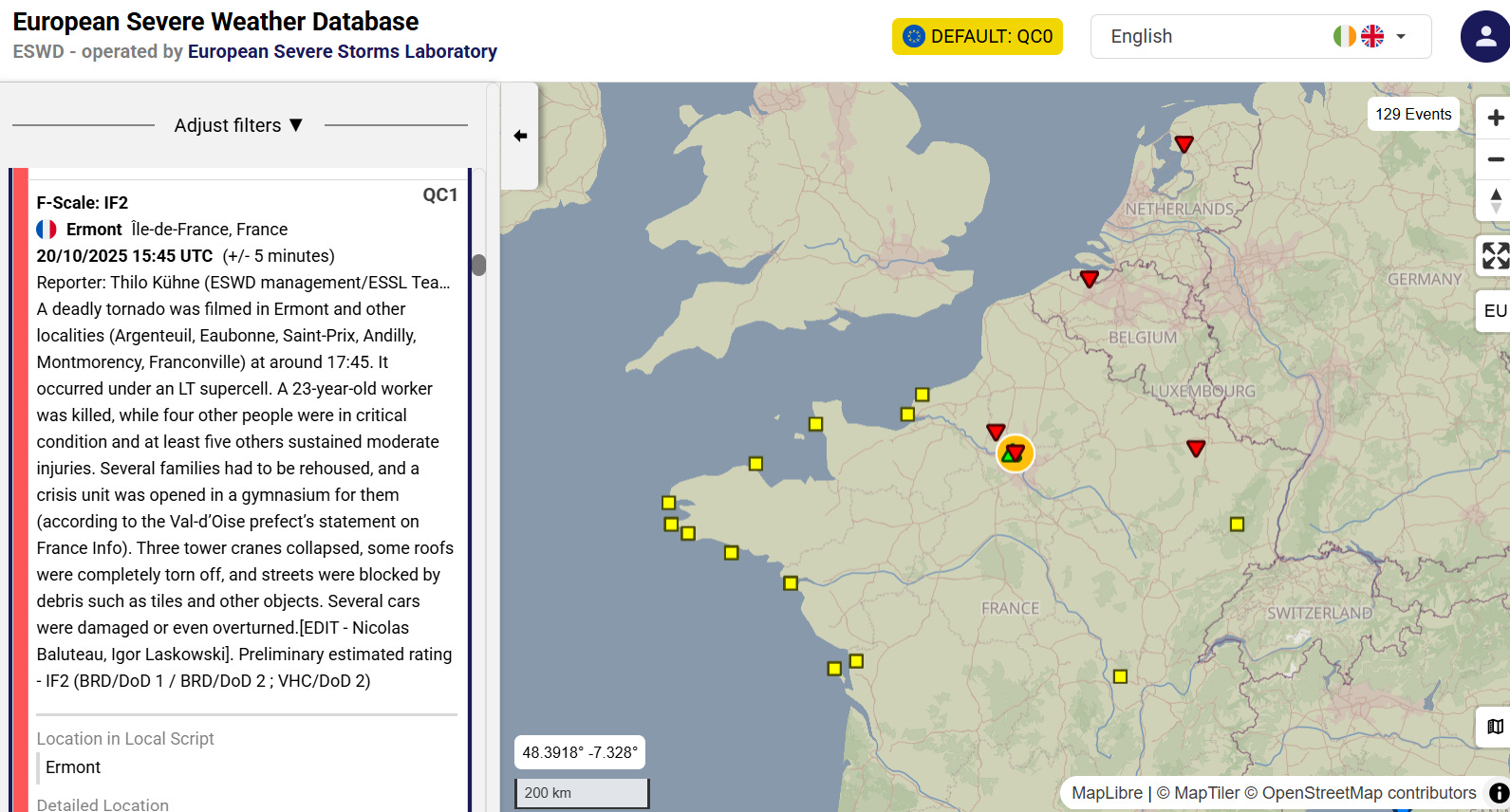 One of the key projects of ESSL is to maintain the European Severe Weather Database (ESWD) with the goal of providing the public with a quality controlled database of severe thunderstorm and tornado events in Europe. The above screenshot is from the ESWD’s entry for Monday’s tornado near Paris, which has been preliminarily rated an IF2. “IF” stands for International Fujita Scale, a modified version of the Fujita scale to allow for improved damage ratings in Europe. An IF2 tornado has estimated instantaneous speeds of 220 to 249 km/h, or 137 to 155 mph. (The Enhanced Fujita estimated wind speeds are 3-second gusts not instantaneous winds, so there is not a one to one comparison between the two scales as far as windspeeds.)