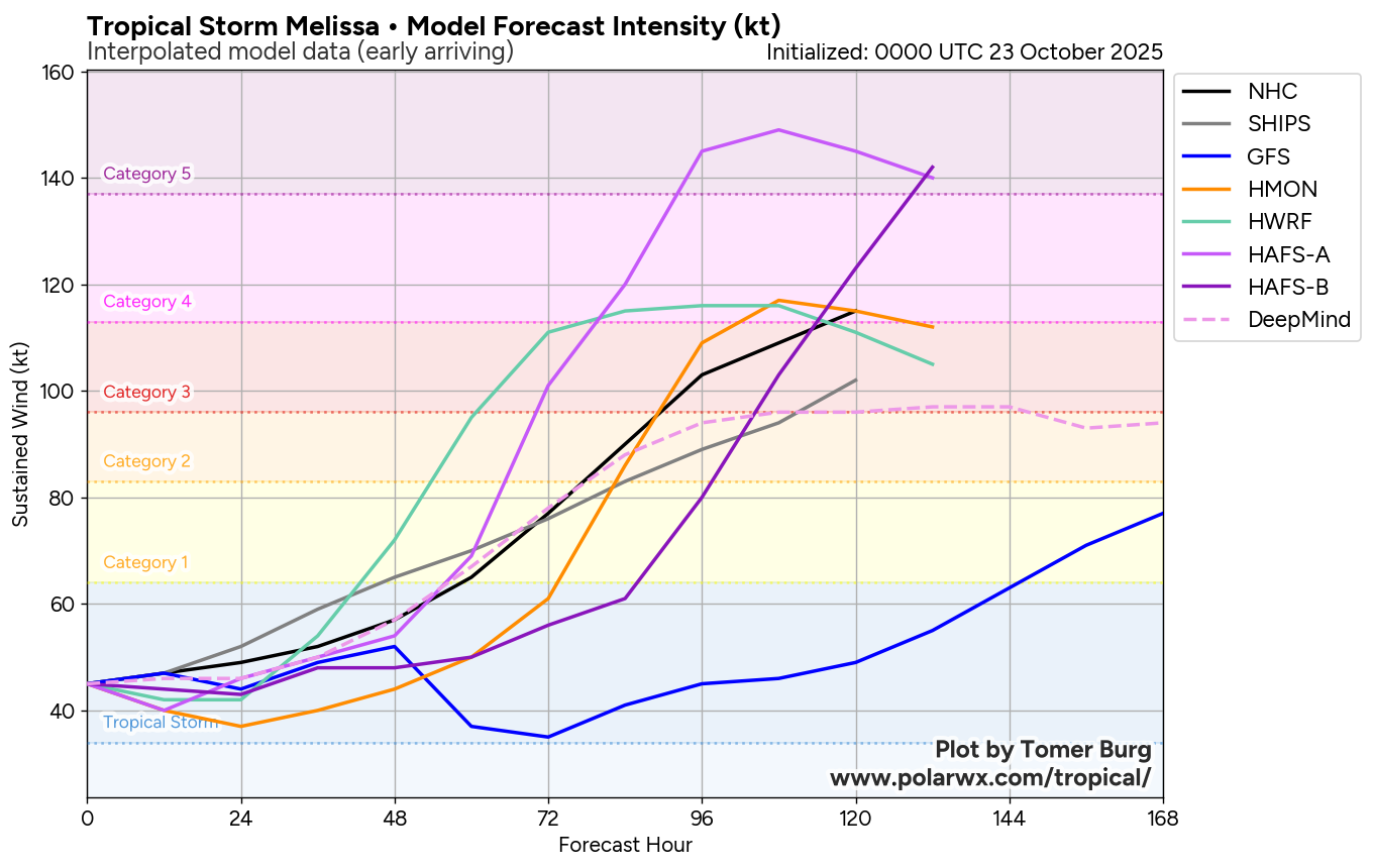 This also means that Melissa will be over the extremely warm water of the central and western Caribbean for the next several days, and with wind shear expected to decrease substantially, this further increases the likelihood that Melissa will become a powerful hurricane over the Caribbean by this weekend.