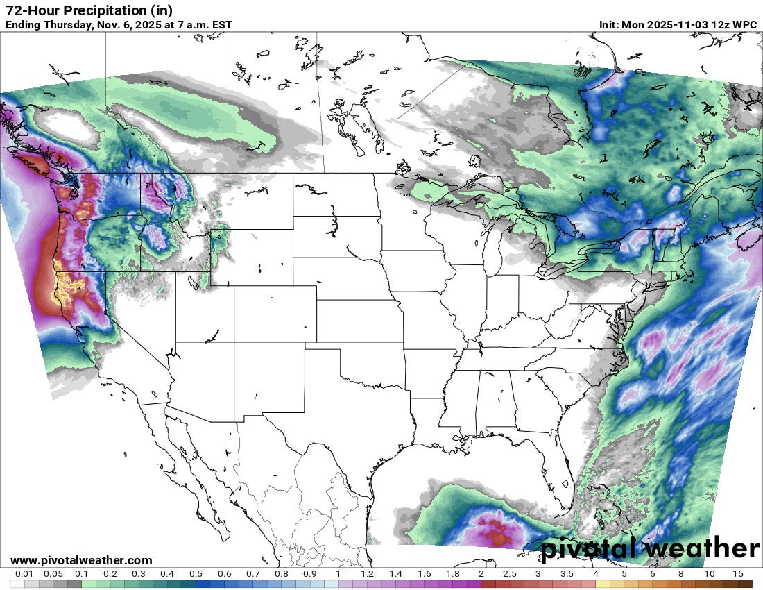 Stateside, most of the country will be quiet the next few days, with the primary exception being in the Pacific Northwest, where a series of storm systems will bring waves of heavy rain and some (very) high elevation snowfall. A number of record high temperatures were set in the western half of the country on Monday, and unseasonable warmth will be gradually spreading east through the week.