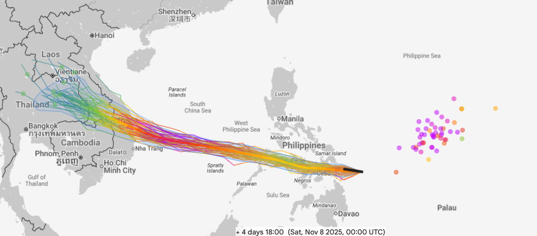 Another system (Invest 90W) is developing well east of the Philippines today, and the Google DeepMind AI (GDM) ensemble shows this system developing into a powerful (equivalent to category 4 or 5 on the Saffir-Simpson Hurricane Wind Scale) by the end of this week as it moves west. Longer range forecasts begin to show more uncertainty in the track of this system, but it certainly could pose a threat to the northern Philippines by this weekend. This can still be a busy time of year in the western Pacific with some of the most devastating supertyphoons happening in November and December, so we will be watching all of this closely.