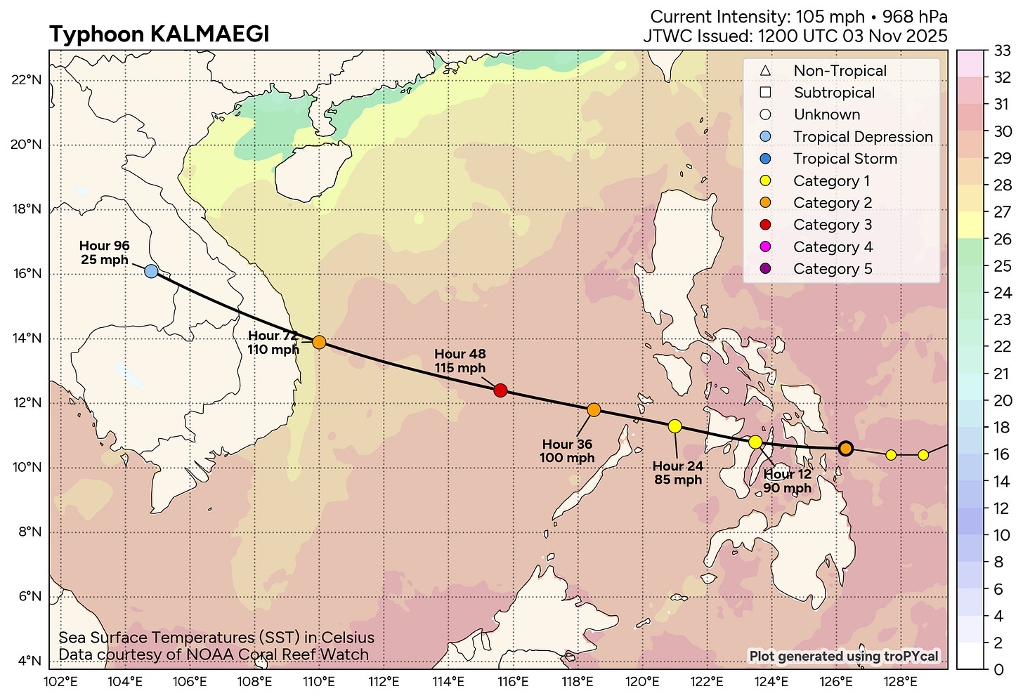 While Kalmaegi will weaken somewhat as it passes over the islands of the Philippines, it should reintensify as it moves west across the South China Sea, and is likely to reach the equivalent of major hurricane intensity. It may weaken a bit prior to landfall in Vietnam but should still be a powerful typhoon with significant impacts when it makes landfall in a few days.