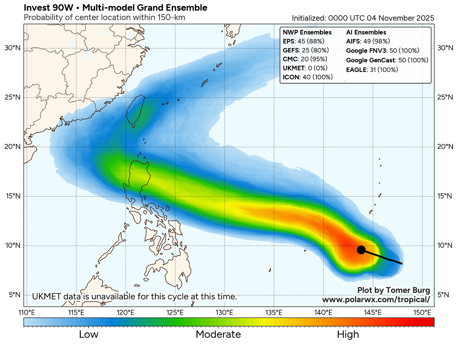 As far as track, the GDM has a strong signal for this system to make landfall in Luzon in the northern Philippines. The “grand” ensemble from polarwx.com that includes all of the hundreds of various model ensemble members shows the most likely track in this area, however there is more spread as a decent number of the physics based ensemble tracks are a bit farther north. The bottom line is that while there is still some uncertainty, for this time range (5 days) the probability of a landfalling supertyphoon in the northern Philippines is rather high, and this will be a situation to watch very closely in the coming days.