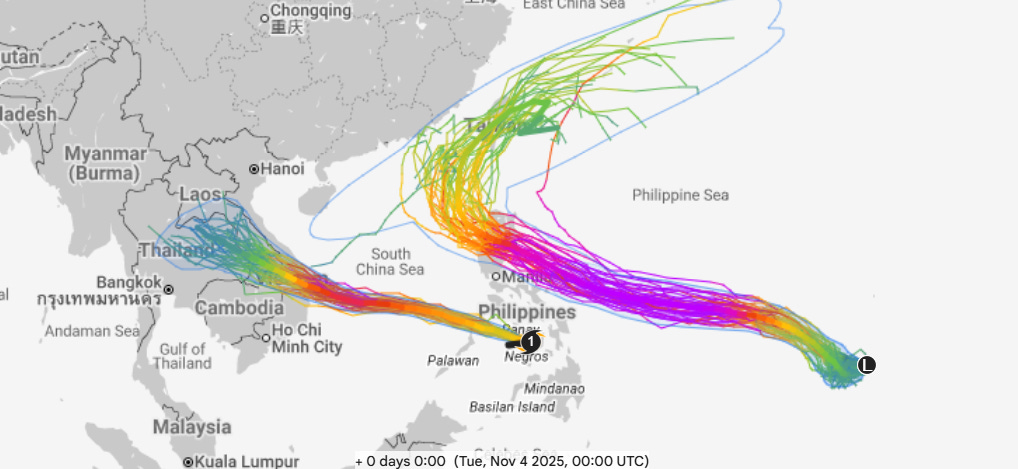 As Kalmaegi pulls away from the Philippines over the next couple of days, it should encounter a relatively favorable environment for intensification, and the Joint Typhoon Warning Center (JTWC) forecasts its maximum sustained winds to peak at 110 mph over the south China Sea. As can be seen above, the Google DeepMind (GDM) AI system — which has been the best performing model in the eastern Pacific and Atlantic basins this year — is actually a bit more bullish than JTWC. We noted a similar trend with Kalmaegi before it made landfall in the Philippines, and it ended up that the GDM was too strong as discussed in this excellent blog post by hurricane researcher Andy Hazelton. It will be interesting to see if a similar trend holds for this forecast.