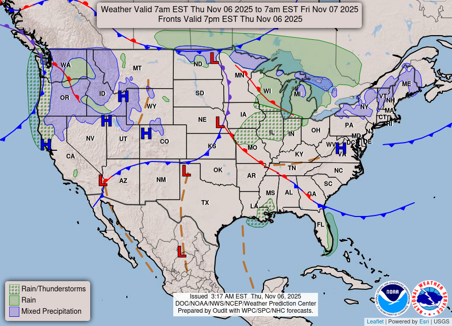 Relatively quiet weather is anticipated across much of the US the next day or two as shown in the Weather Prediction Center forecast weather map above, although significant precipitation will continue in the Pacific Northwest. Unseasonably warm temperatures will dominate most of the country, but the focus headed into the weekend will be on a shift in the weather pattern which will bring unusually cold air to the eastern half of the country, while even warmer conditions build in the West.