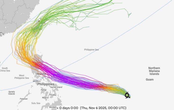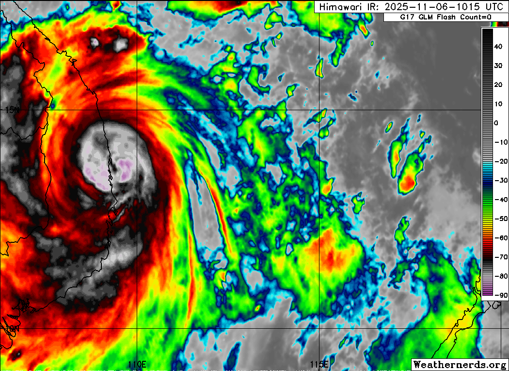 Typhoon Kalmaegi made landfall in central Vietnam several hours ago. It peaked at a category 4 on the Saffir-Simpson Hurricane Wind Scale last evening (US time), before weakening a bit just before landfall. The slight weakening before landfall was anticipated, but unfortunately Kalmaegi did get significantly stronger than forecast before than weakening, and impacts in central Vietnam were likely significant. We discussed in Tuesday’s post how the Google DeepMind (GDM) AI had overforecast the intensity of Kalmaegi before its Philippines landfall, and was similarly more bullish over the South China Sea. It looks like this time, though, the GDM was unfortunately correct with its stronger forecast.