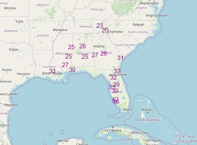 Numerous record low temperatures are possible in the Southeast early next week, with Tuesday (current forecast record low mins shown above) the peak of the cold. Lows in the 30s will be possible as far south as the I-4 corridor in central Florida.