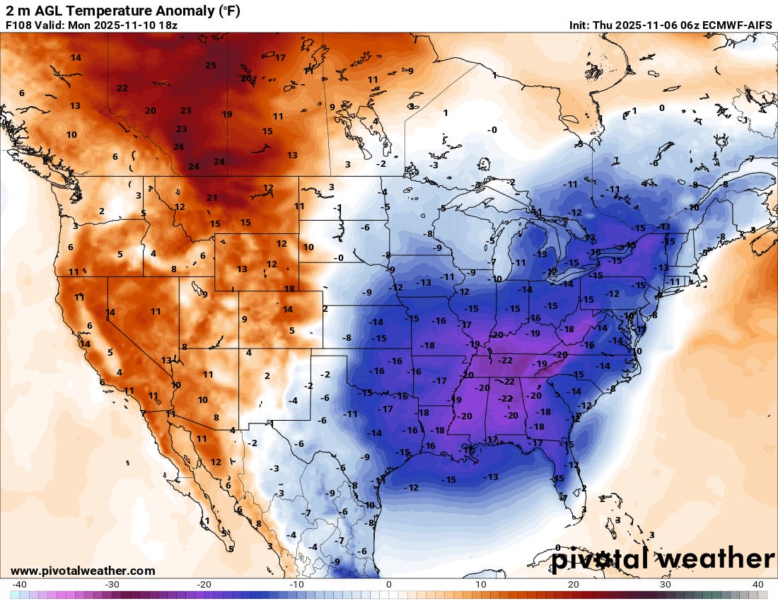 By Monday, temperatures 15 to 25 degrees F below normal will be common over the eastern half of the country, with the core of the cold anomaly over the Southeast. Water temperatures over the Great Lakes are still quite warm, and as a result this outbreak of cold air should bring significant lake effect snow downstream of all of the lakes early next week.