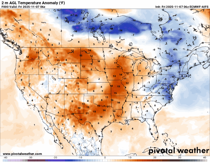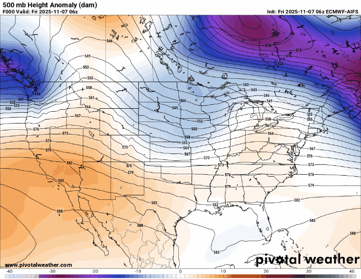 The evolution of the weather pattern in the middle and upper levels of the atmosphere is what is driving this outbreak of cold air. To illustrate that, above I have a loop from the most recent European AI model of the heights (similar to isobars, i.e., pressure lines, on a surface weather map) at 500 millibars — about 18,000 ft AGL. The image is how the heights are differing from normal, i.e., blue is where there is lower than normal heights and shows upper level troughs of low pressure, while orange/red shows above normal heights and areas of upper level high pressure.