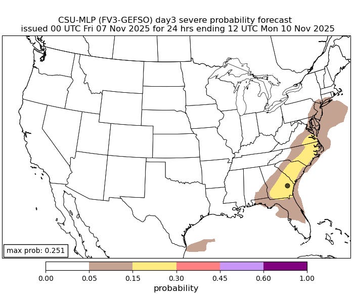 Additional thunderstorms are expected in the Southeast this weekend, and as another stronger upper level disturbance moves through the region on Sunday, a risk of severe thunderstorms could evolve in coastal areas from the Tidewater to southern Georgia as shown by the Colorado State University Machine Learning Probabilities system above — the forecast level of probabilities are equivalent to a level 2 of 5 risk from SPC.
