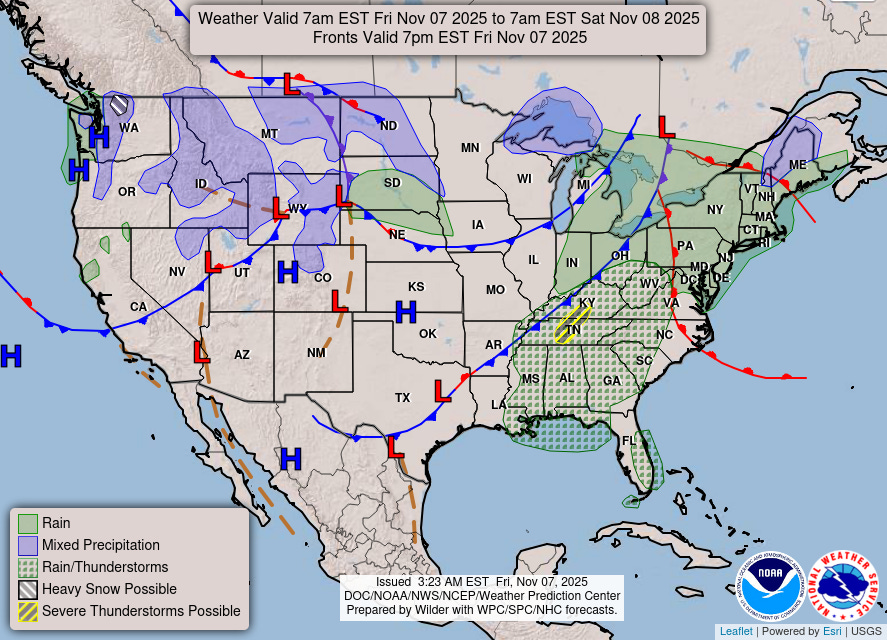 As far as precipitation risks, the first disturbance and cold front moving through the East today will bring scattered to numerous showers and thunderstorms to much of the eastern third of the country. A few severe storms are possible from the Tennessee Valley to the central Gulf Coast, with the greatest risk over middle Tennessee and south central Kentucky where the Storm Prediction Center has a slight (level 2 of 5) risk area. Damaging wind gusts are the primary severe weather risk.