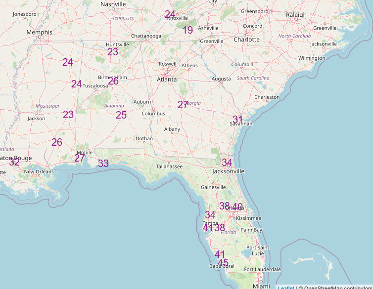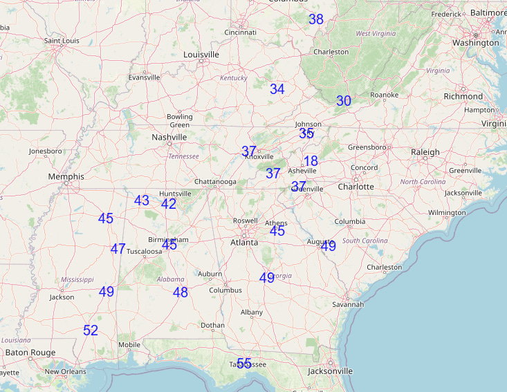 Monday into Tuesday should see the coldest temperatures, with numerous forecast record low maximums (top graphic) and record low minimums (bottom graphic). Low temperatures in the 30s will be possible all the way south to the I-4 corridor in central Florida. While this is certainly unusually cold air for this early in the season, it is not near monthly cold records given that we are early in the month and colder temperatures have occurred later in November. I did a spot check on several locations to see how this compares to all-time cold records for the first half of November, and from what I saw the forecast temperatures for early next week still look several degrees above those readings as well.