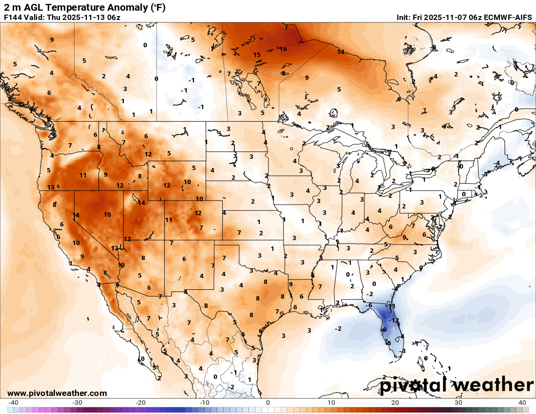 This means while it will be unusually cold, it will be short-lived, and by midweek the temperature anomaly map shows that most of the country (except Florida) will be back to near or above normal over most areas.